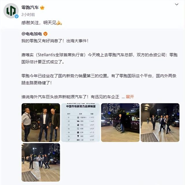有博主称,全国第四大汽车集团、欧洲汽车巨头Stellantis全国首席执行官唐唯实(Carlos Tavares)夜深到访零跑汽车总部,据此得出“两边合伙公司臆想要认真建立”的论断,公司名为零跑海外。