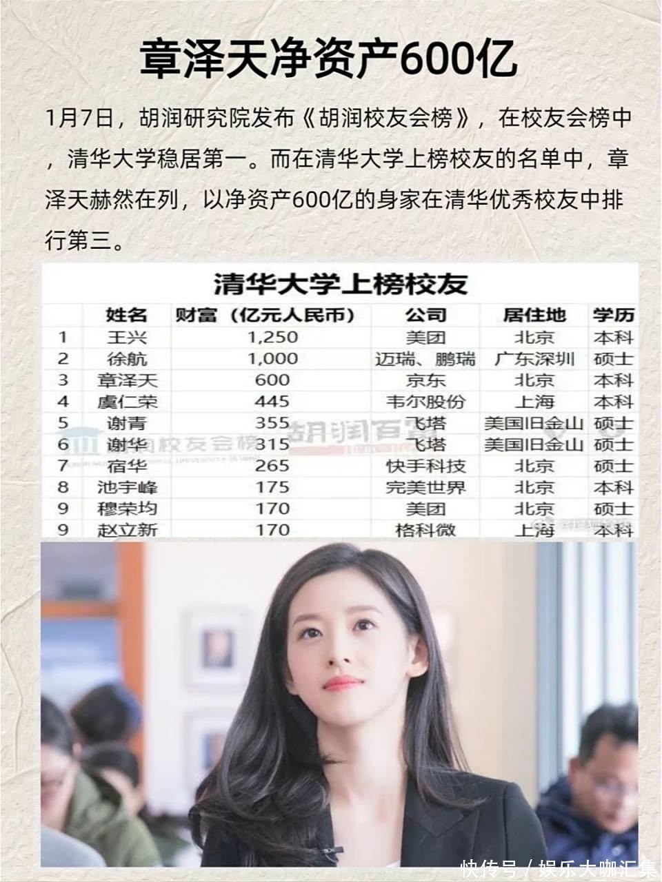 18. 如今,她还担任京东公益基金会荣誉理事长,耐久竭力于儿童公益样式,组织物质捐赠,鼓动社会热心当作。2024年,她以600亿元净资产(据胡润学友会榜标注为佳耦共同资产)入选清华大学优秀学友榜单,位列第三。