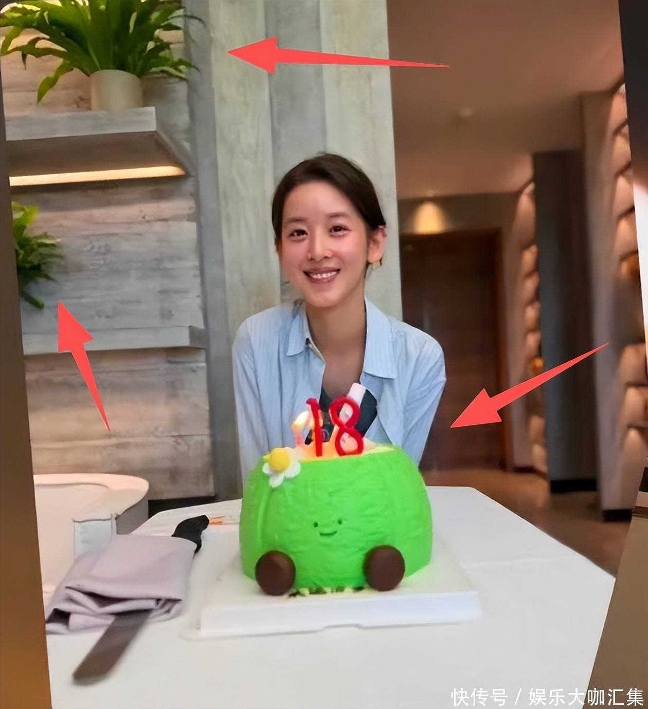 5. 她眼前的小桌上舍弃着一款簇新高雅的“椰子绿”蛋糕,中央插着数字为“18”的烛炬,寓意“永远十八岁”,适值呼应了她配文所说的“本年的18岁过得太快啦”。