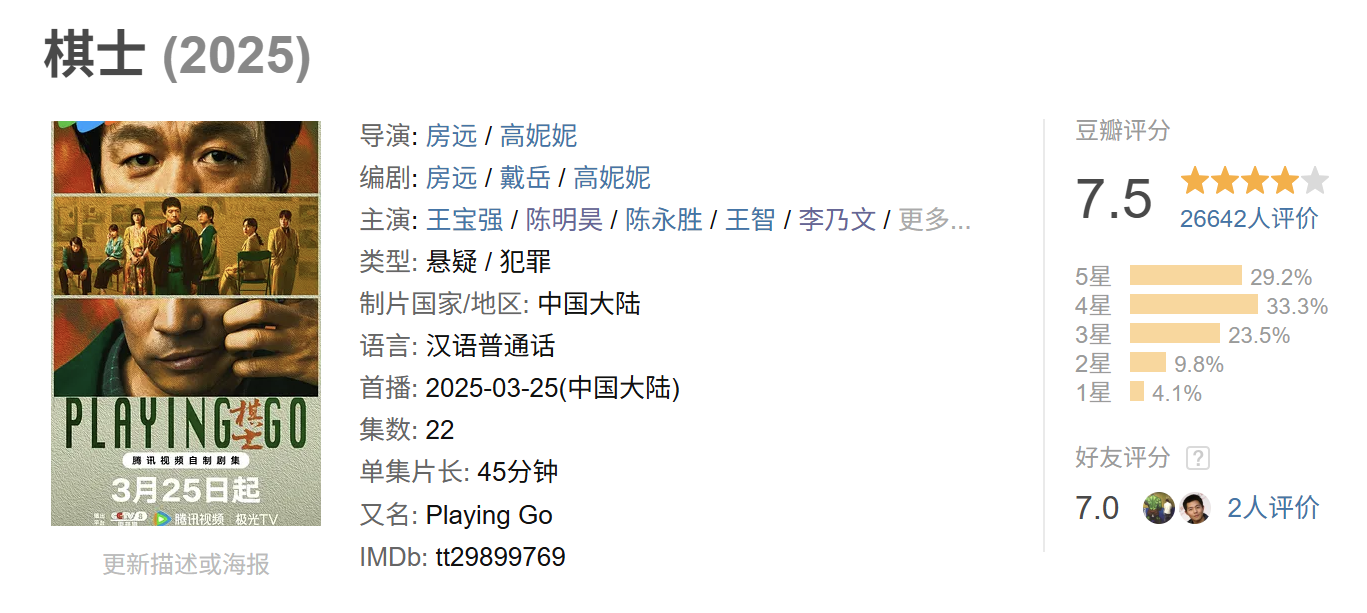 王宝强主演的《棋士》上线过半,豆瓣开出7.5分shibo体育游戏app平台,其中四星和五星好评越过62%。
