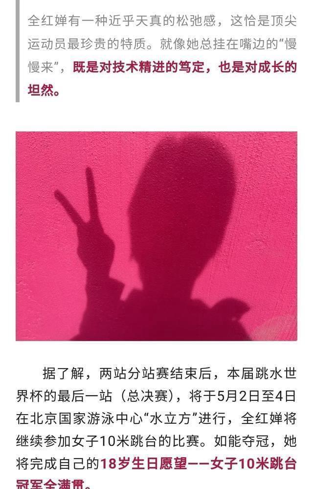 这件事以致惊动了央媒,4月14日,东说念主民日报发文报说念了这件事,直戮力于挺全红婵,称其身上的迫害感是认知员最罕见的特色,临了还给全红婵加油打气。
