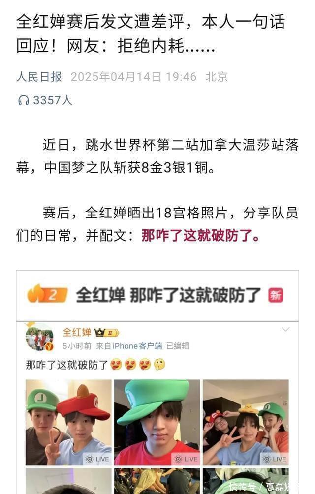 4月14日,全红婵晒出18宫格相片共享队员们的日常,并发文“那咋了,这就破防了”。