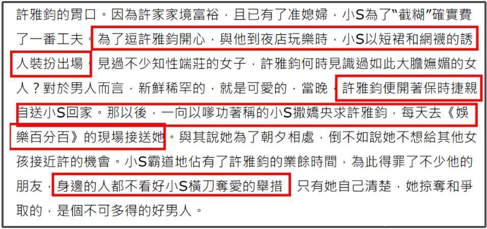 家喻户晓,以大小S为首的华冈七青娥,从小就抓着于嫁朱门,为了嫁进许家,小S可谓使尽浑身解数。