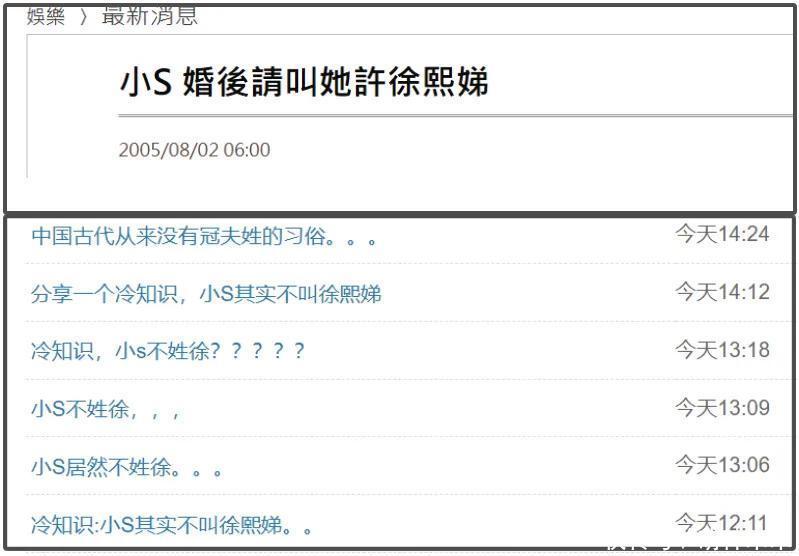 前排科普一个冷常识,本来大小S也曾弗成被叫徐家姐妹了,因为小S冠了夫姓,授室之后就更名为“许徐熙娣”了。