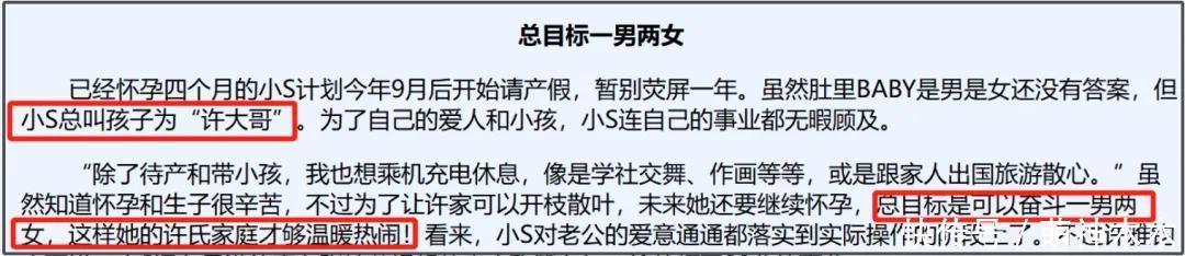 奉子成亲之后,小S天然嘴上说着生一男二女就好,但对着我方的第一胎就喊“许老迈”。