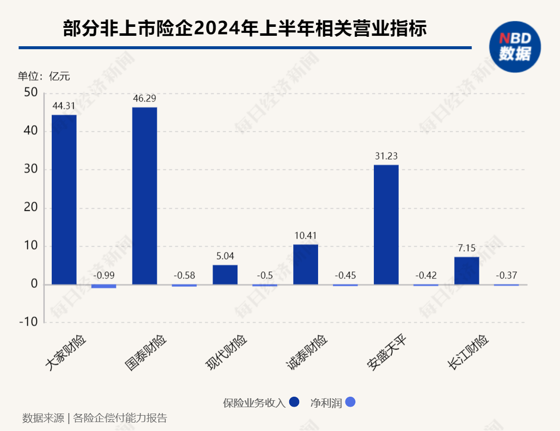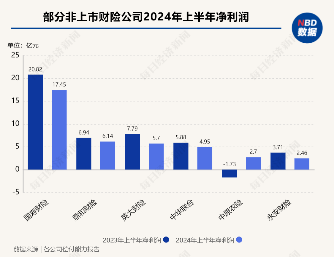 在财险业“马太效应”下,一些中小公司仍深陷盈利难窘境。记者统计发现,2024年上半年,有23家非上市财险公司堕入亏蚀,亏蚀居前的公司包括内行财险、国泰财险、当代财险、诚泰财险、安盛天平、长江财险、融盛财险、海峡金桥等,亏蚀幅度均不超过1亿元。