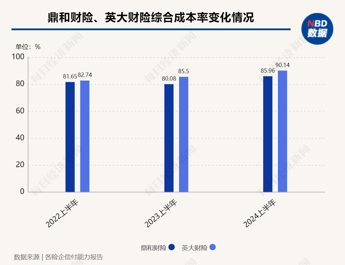 “电力系”财险公司鼎和财险、英大财险上半年净利润分袂为6.14亿元、5.7亿元。从详尽成本率数据看,两家公司在行业中处于较低水平,但与客岁同期比拟均有所上涨。其中,鼎和财险详尽成本率上涨了5.88个百分点至85.96%,英大财险上涨了4.64个百分点至90.14%。从投资收益率数据看,鼎和财险从客岁同期的2.12%降至1.84%,英大财险则从1.41%降至0.11%。