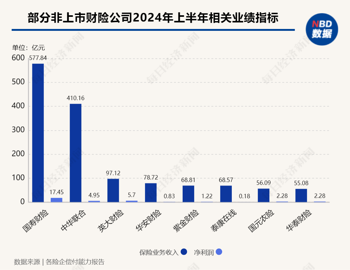 非上市财险公司中,国寿财险、中华相接财险两家保费限制大幅首先于其他公司,2024年上半年,国寿竣事保障业务收入577.84亿元,同比增长3.37%;中华相接财险保障业务收入410.16亿元,同比增长3.92%。其余公司保费限制均不及百亿,8家公司上半年保障业务收入不及1亿元。