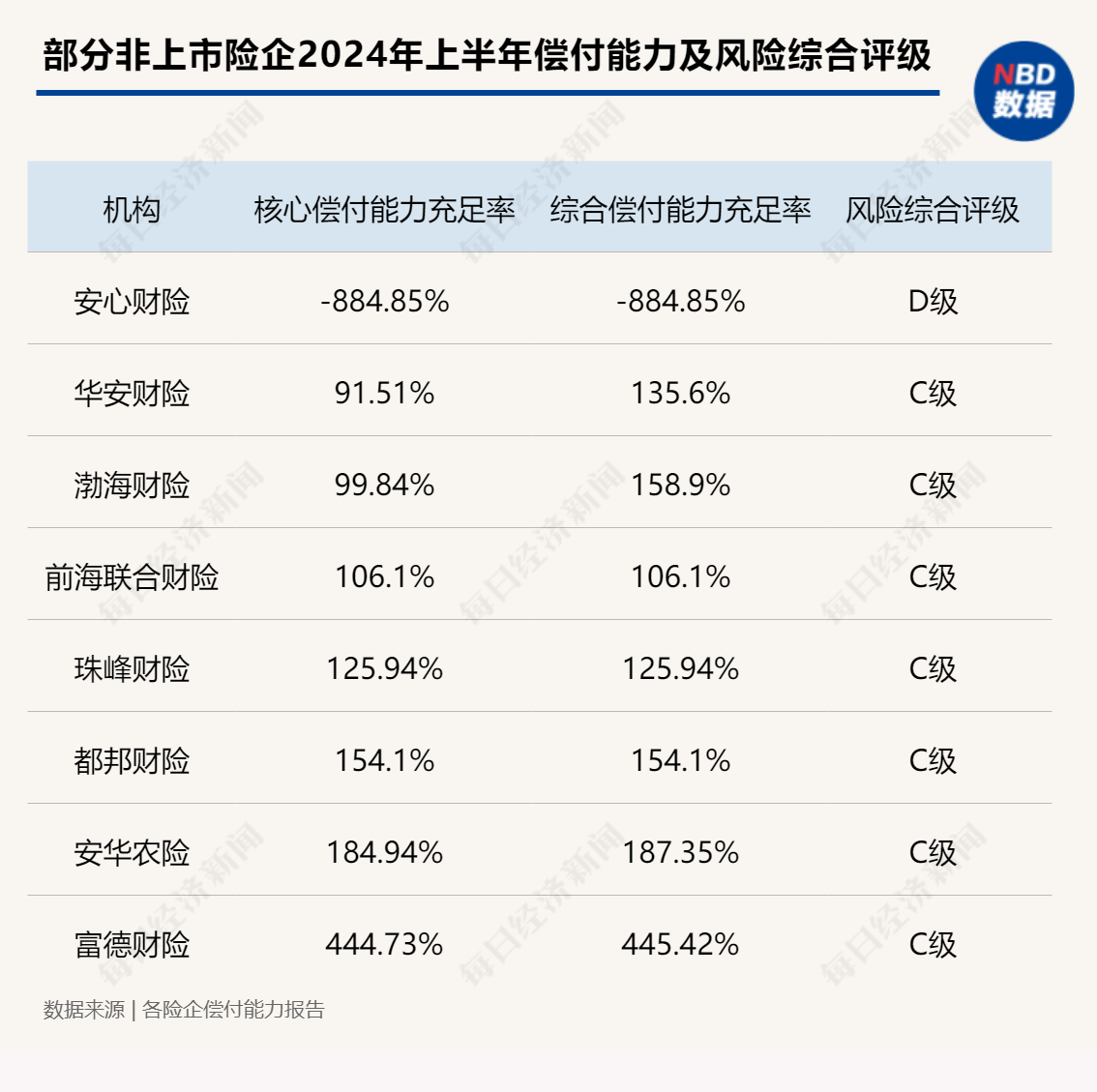 《逐日经济新闻》记者介意到,不包含未露馅险企,保障公司最新一期风险详尽评级露出,省心财险中枢偿付智商富裕率和详尽偿付智商富裕率均低至-884.85%,远远低于监管条目的50%及100%,同期公司的风险详尽评级为D级;此外,华安财险、渤海财险、前海相接财险、珠峰财险、皆邦财险、安华农险、富德财险风险详尽评级为C级。这也意味着,这8家险企偿付智商未达标。
